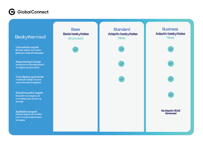 GlobalConnect tilbyder flere niveauer af DDoS-beskyttelse for at imødekomme forskellige behov: Base DDoS Protection: En standard, fuldautomatisk løsning integreret i GlobalConnects kerne-IP-netværk, der dæmper angreb ved hjælp af kendte DDoS-signaturer. Adaptive DDoS Protection Standard: Tilbyder kundespecifik trafikovervågning på GlobalConnects backbone-netværk. Filtrering aktiveres efter en kort forsinkelse ved opdagelse af et angreb ved hjælp af et universelt filter på kundens IP-undernet. Inkluderer rapportering og realtidsadvarsler. Adaptive DDoS Protection Business: Omdirigerer trafik gennem dedikerede sikkerhedscentre for at fjerne skadelig trafik, mens legitim trafik passerer. Designet til beskyttelse mod avancerede angreb. Adaptive DDoS Protection Advanced: Inkluderer alle funktioner fra Business-niveauet samt tilpassede afværgestrategier skræddersyet til specifikke miljøer og valgfri beskyttelse mod angreb på applikationslaget.