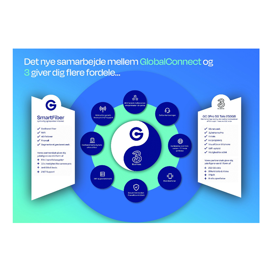Få flere fordele ved samle både din IT, internet og telefoni hos GlobalConnect og 3Business. Med lynhurtig fiber GlobalConnect og 3Business’ fleksible 5g-løsninger indenfor både telefoni og internet kan I få dækket alle jeres netværksbehov.